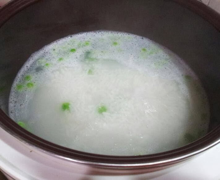 放入青豆也稍微搅拌一下哦!要不时注意锅,听到很大声的“沙沙”声,表示里面大滚赶快打开盖(不然会流出来哦)